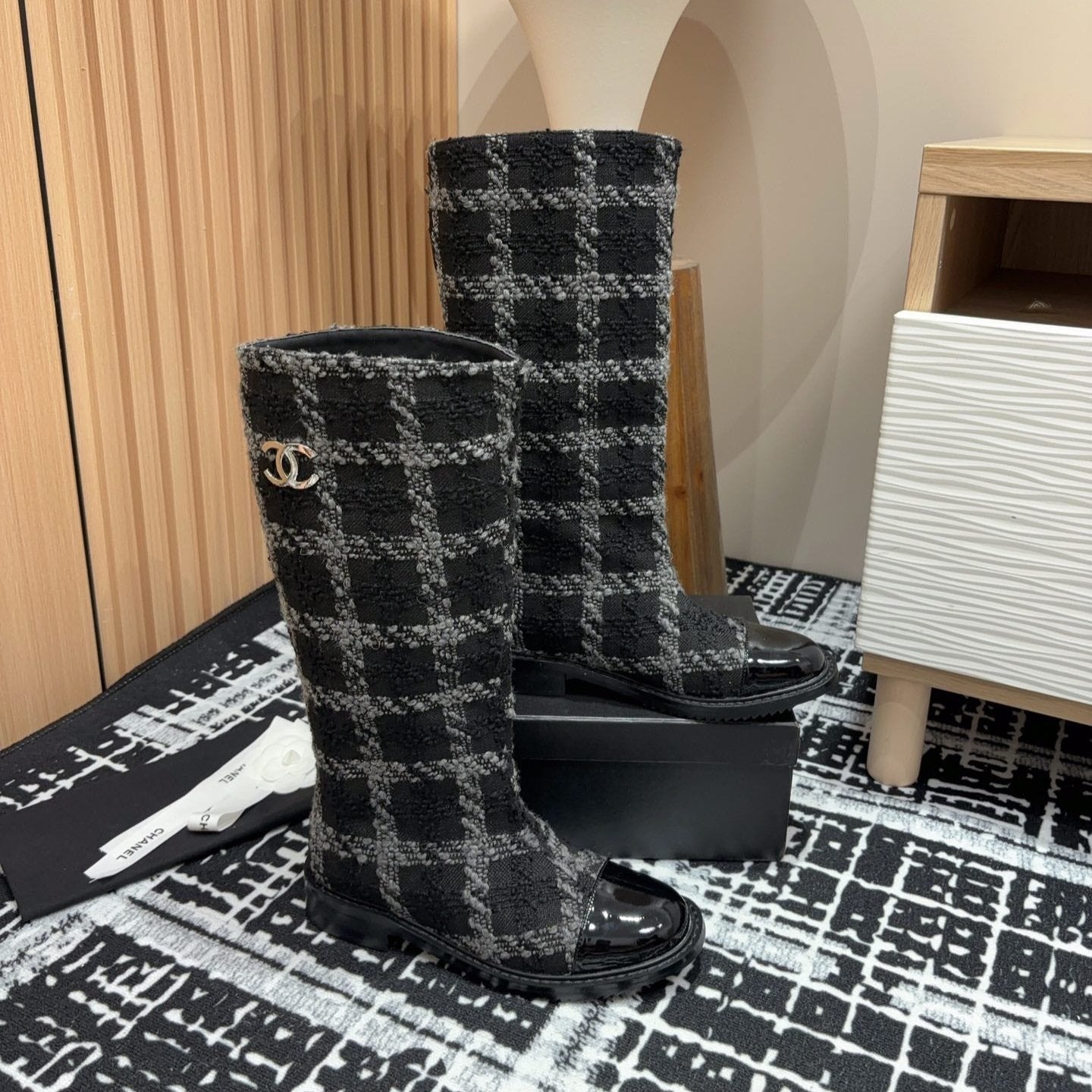 CC High Boots In Black Wool Tweed And Lambskin Gold Hardware
