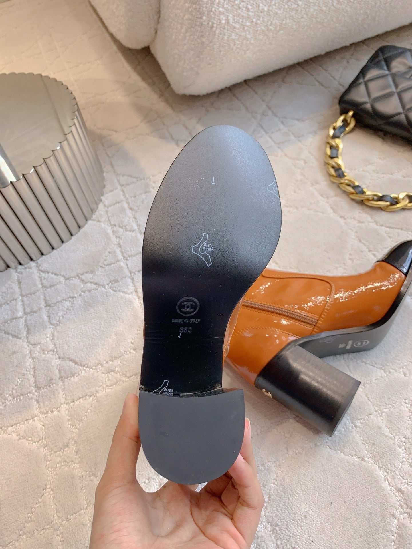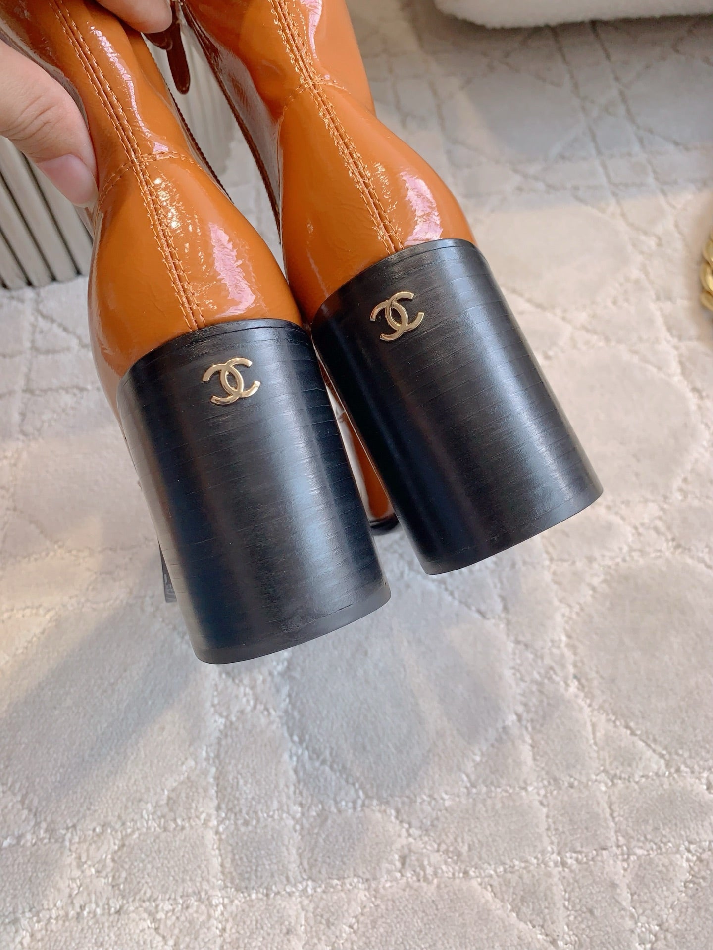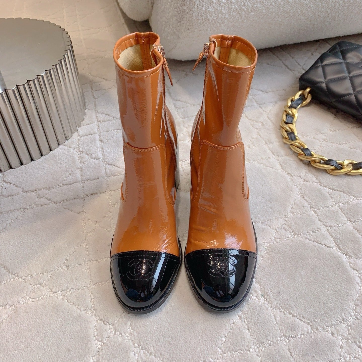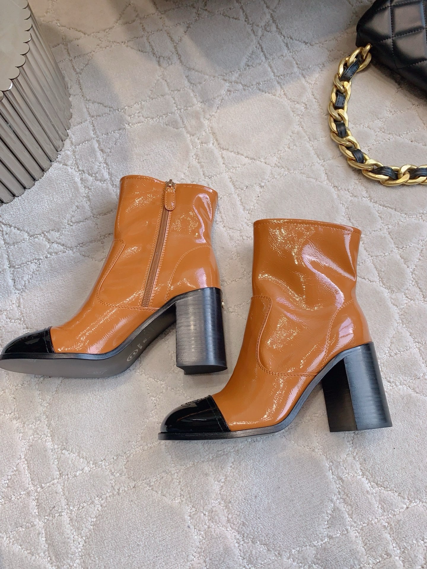 CC 25 Heeled Short Boot Camel Brown mix Black Patent Leather 516678