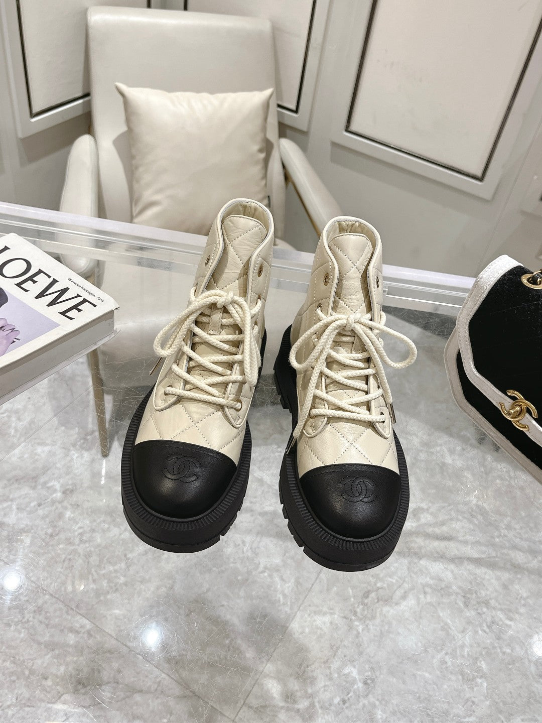 CC Combat Boots 50mm In Ivory White Mix Black Quilted Cowhide And Lambskin 944662
