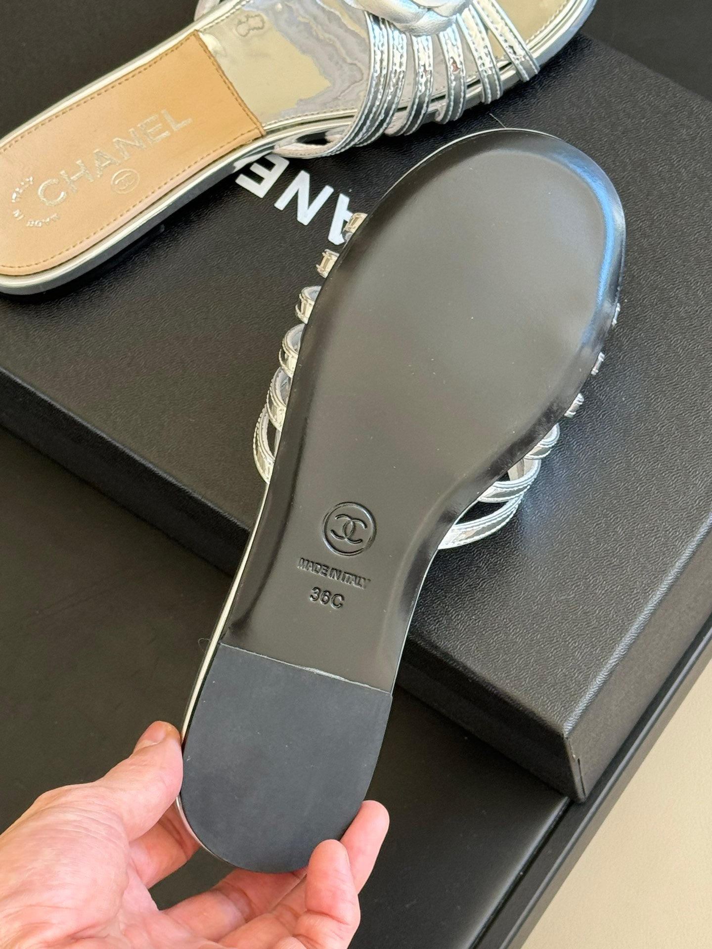 mule sandal flower silver metalic beige lambskin