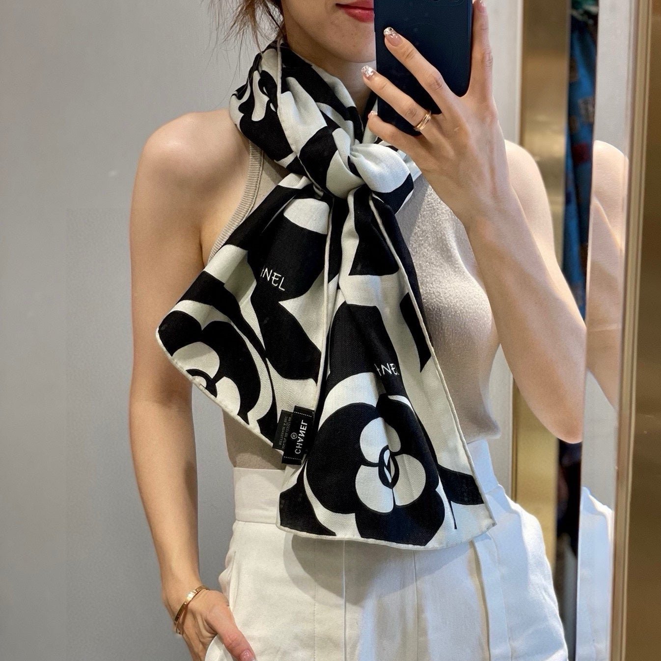 CC Scarf 190 CM In Black And White Floral Print Cashmere Silk 208542