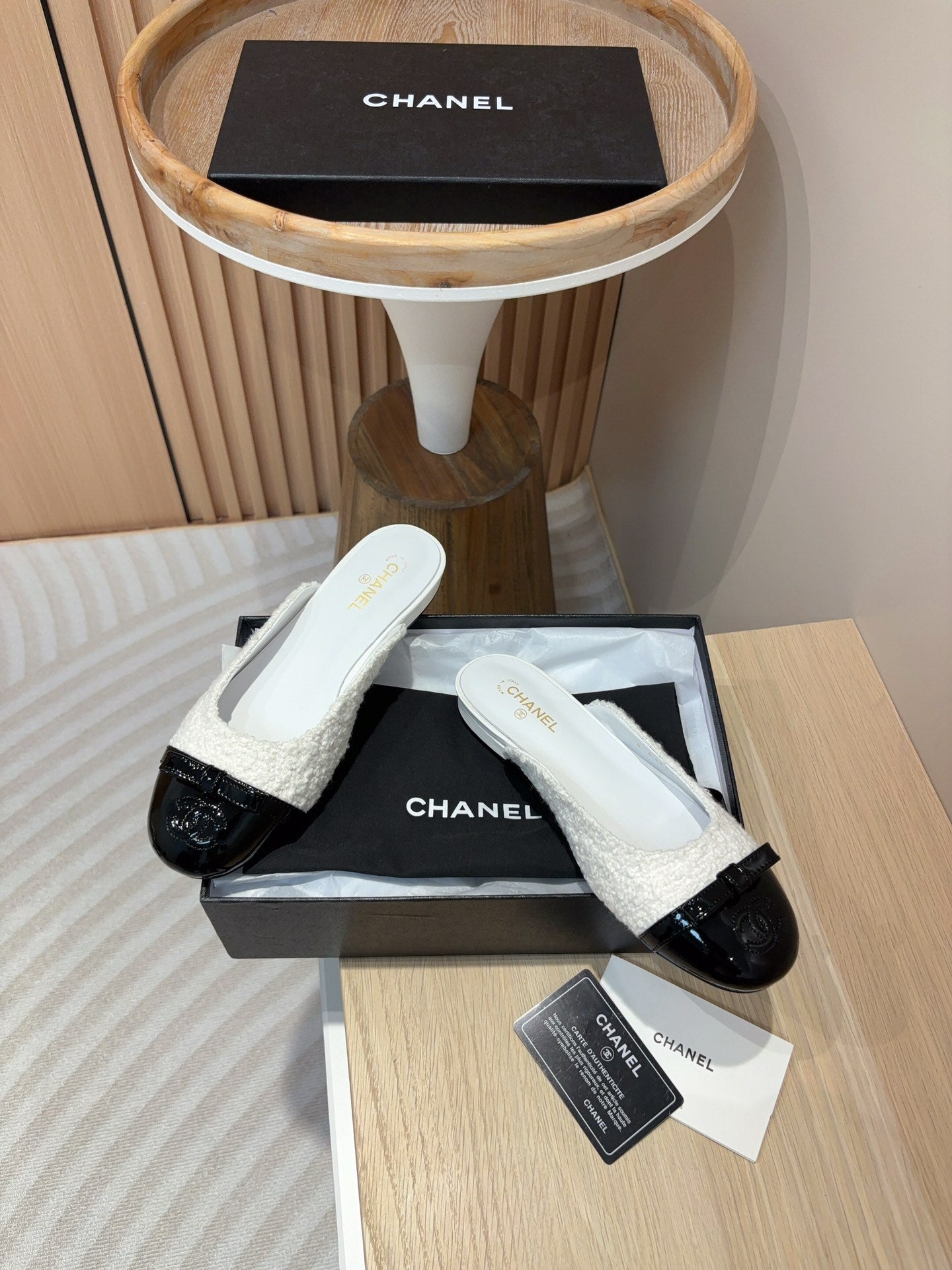 cc mule white tweed black patent calfskin