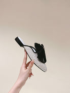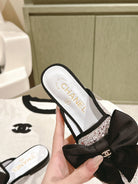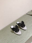 CC JEWELED MULE WITH SILK BLACK BOW IN WHITE LAMBSKIN