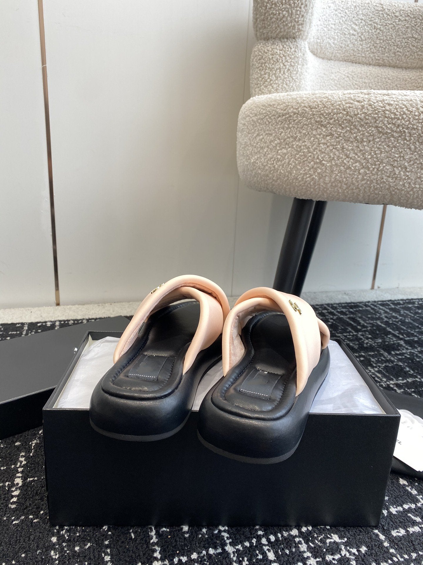 cross puffy slippers beige black lycra fabric
