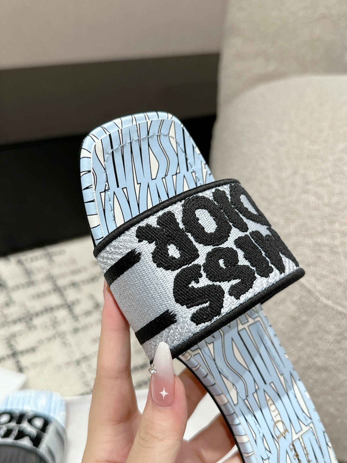 CD Dway Heeled Slide Blue Black Embroidered Cotton