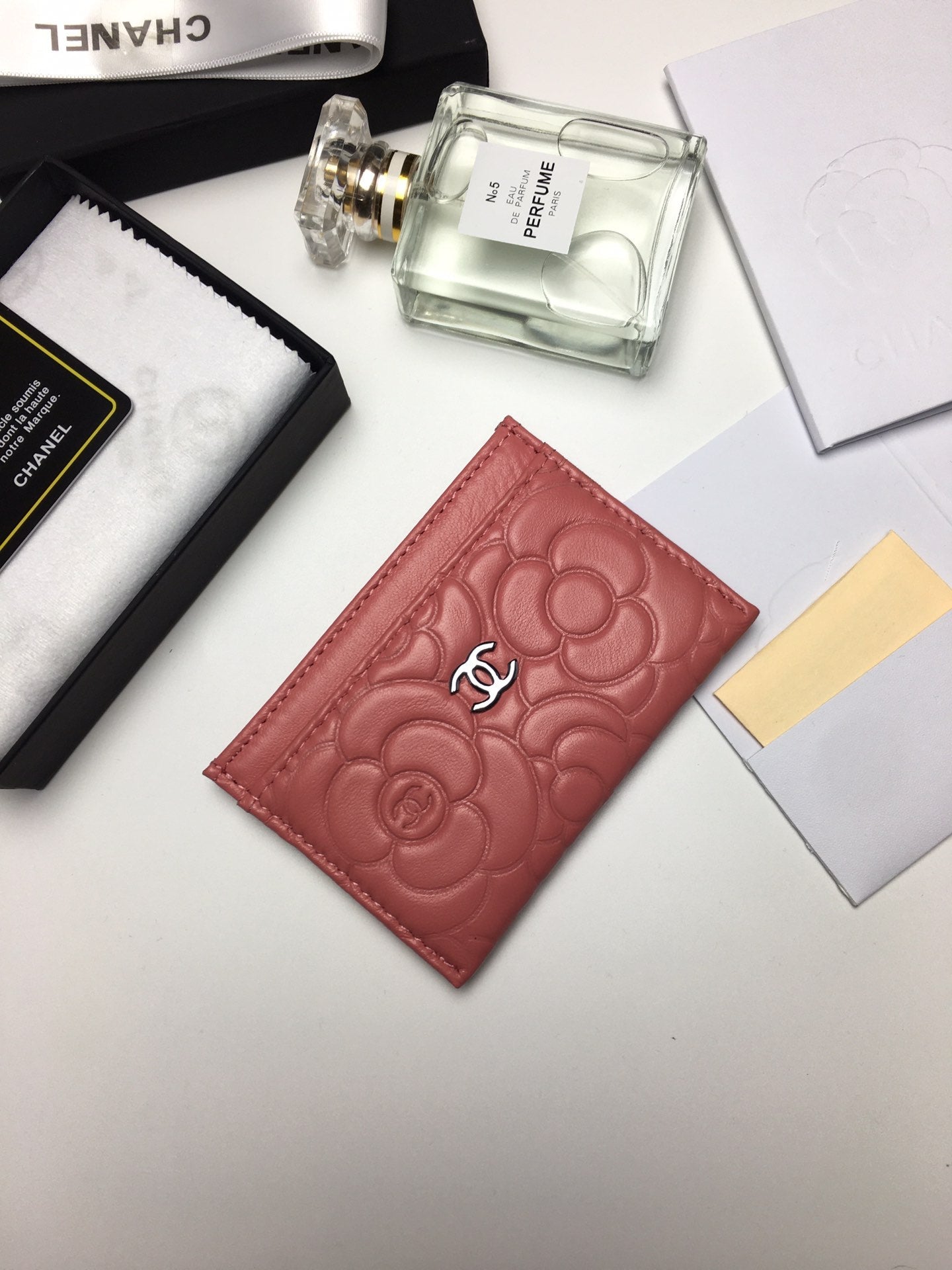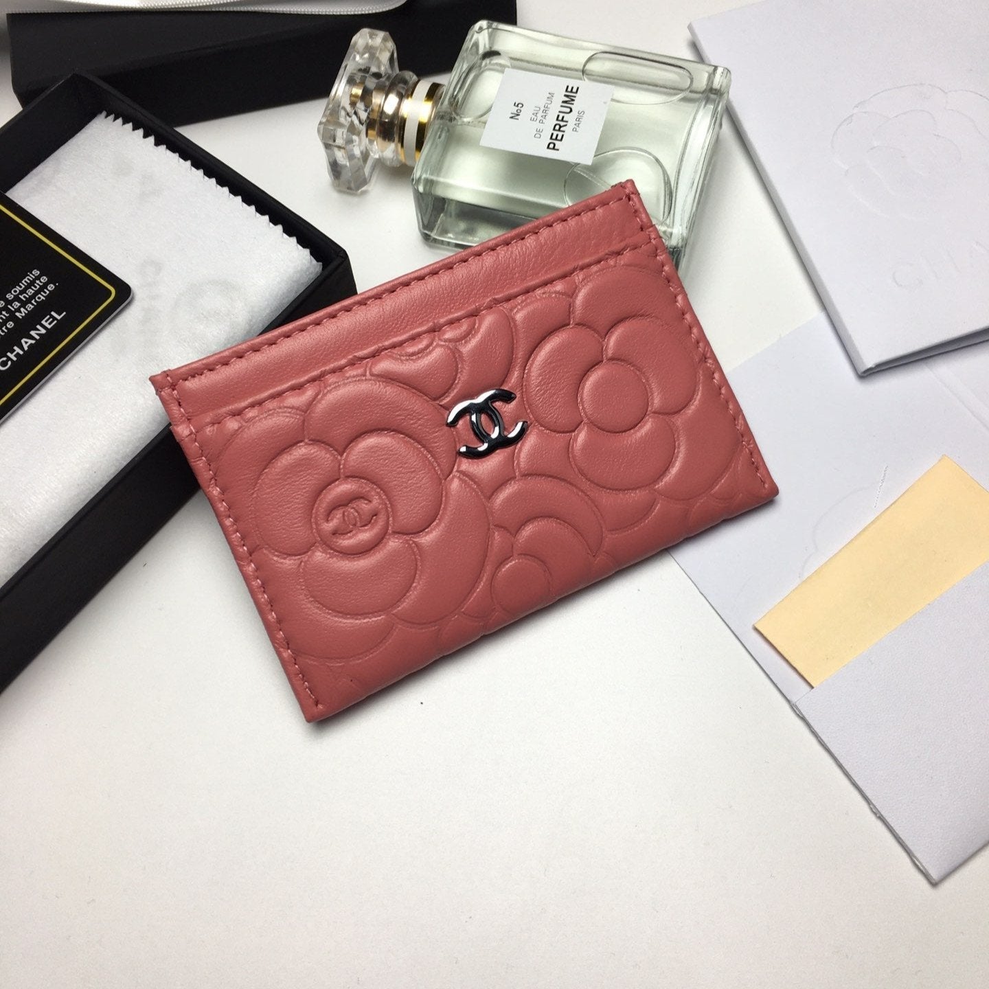 CC FLORAL CARD HOLDER 11.2 CORAL CALFSKIN SILVER ICON