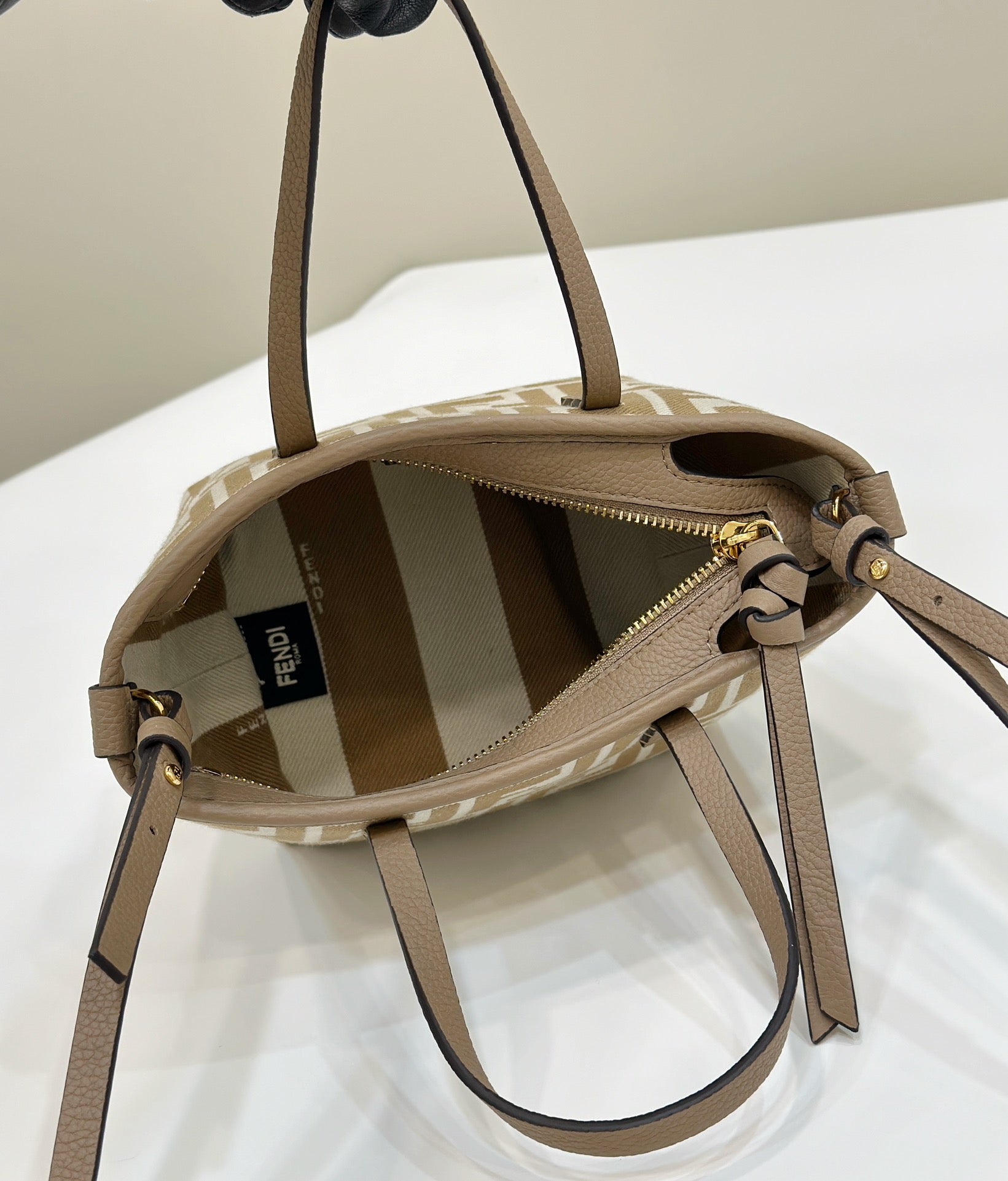 MINI ROLL BAG 15 PEANUT BROWN MIX WHITE FF JACQUARD FABRIC