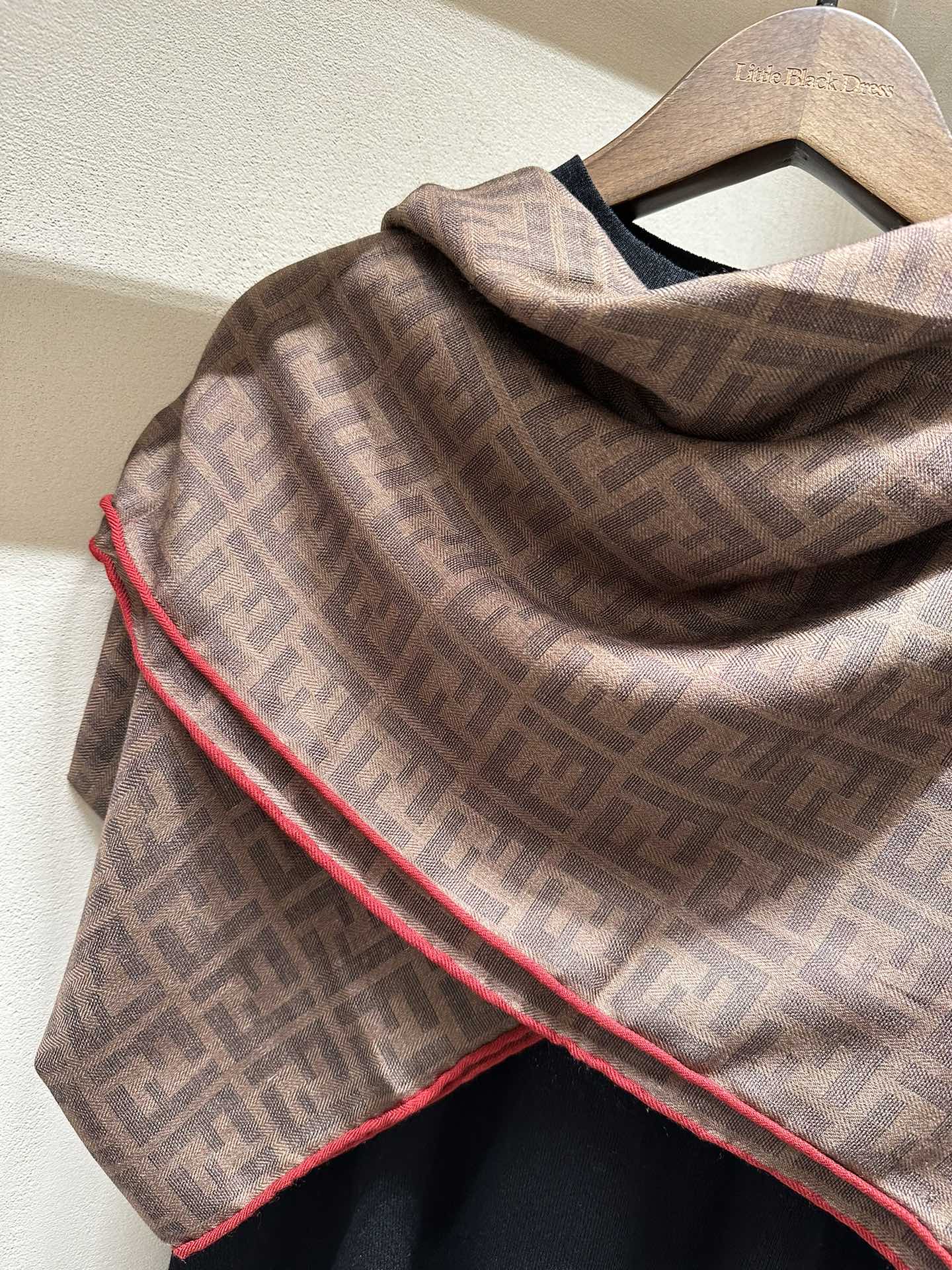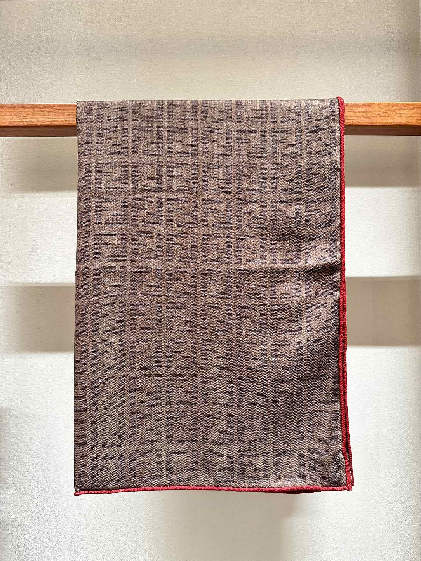FF SHAWL 185 CM IN COFFEE BROWN SILK AND WOOL WITH RED BORDER 413673