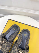 FENDI FLAT SLIPPER IN CEDAR BROWN MIX BLACK MONOGRAM JACQUARD FABRIC WITH GOLD HARDWARE