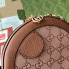 OPHIDIA MINI ROUND SHOULDER BAG 18 IN BLUSH PINK CANVAS AND BROWN LEATHER TRIM
