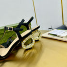 MEDIUM-HEEL SANDAL IN BLACK CALFSKIN WITH RHINSTONES