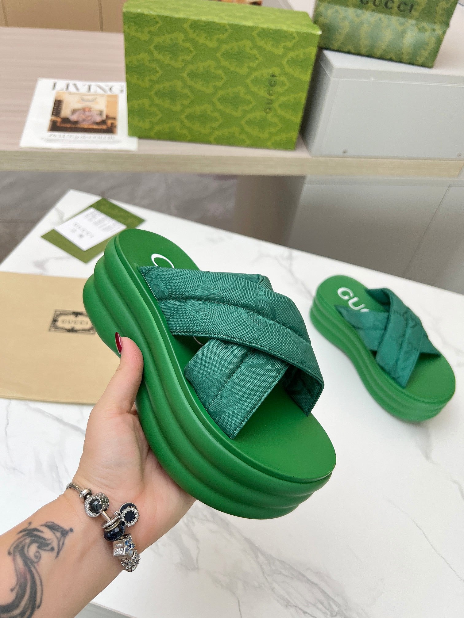 GG waterproof platform slippers green fabric