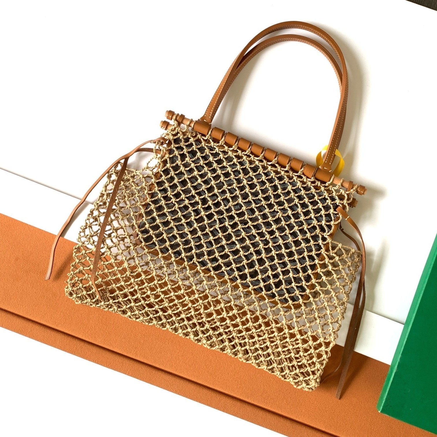 • Material: Woven raffia and calfskin