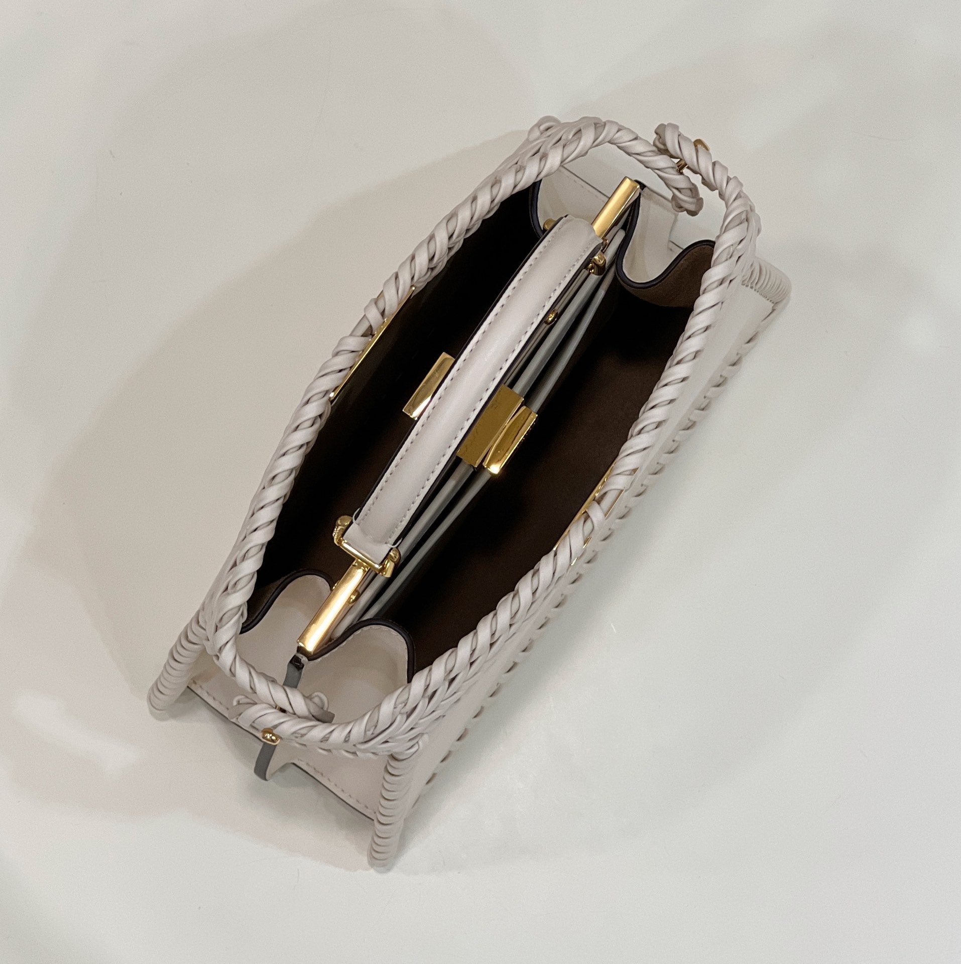 PEEKABOO ISEEU 27 IN WHITE SMOOTH CALFSKIN WITH WOVEN TRIM GOLD HARDWARE
