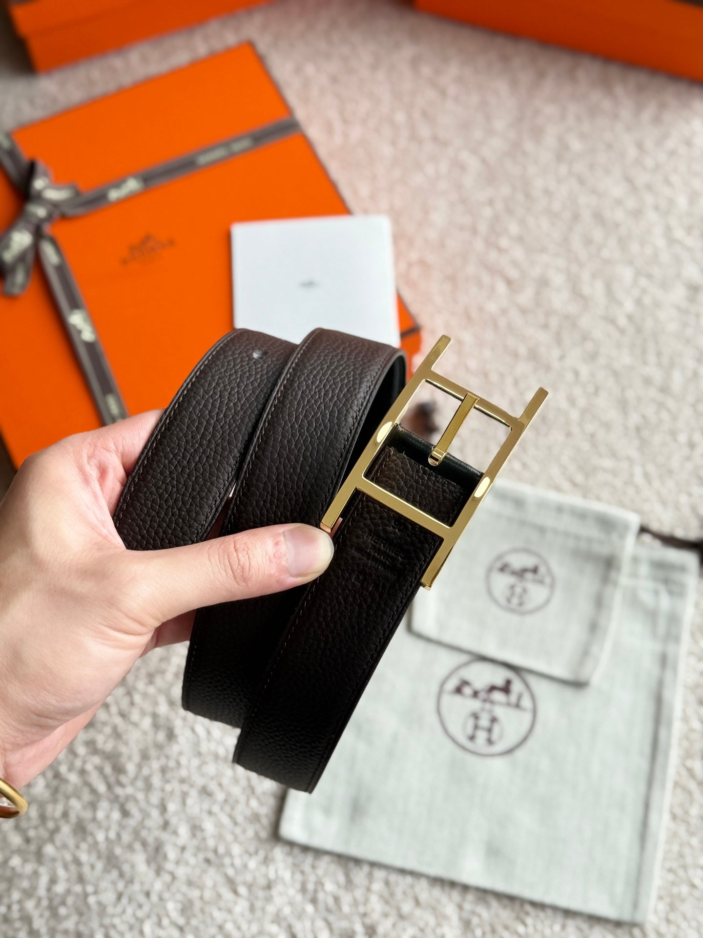 HM Gold Quentin Reversible 32mm Belt Black Chocolate Leather 188090