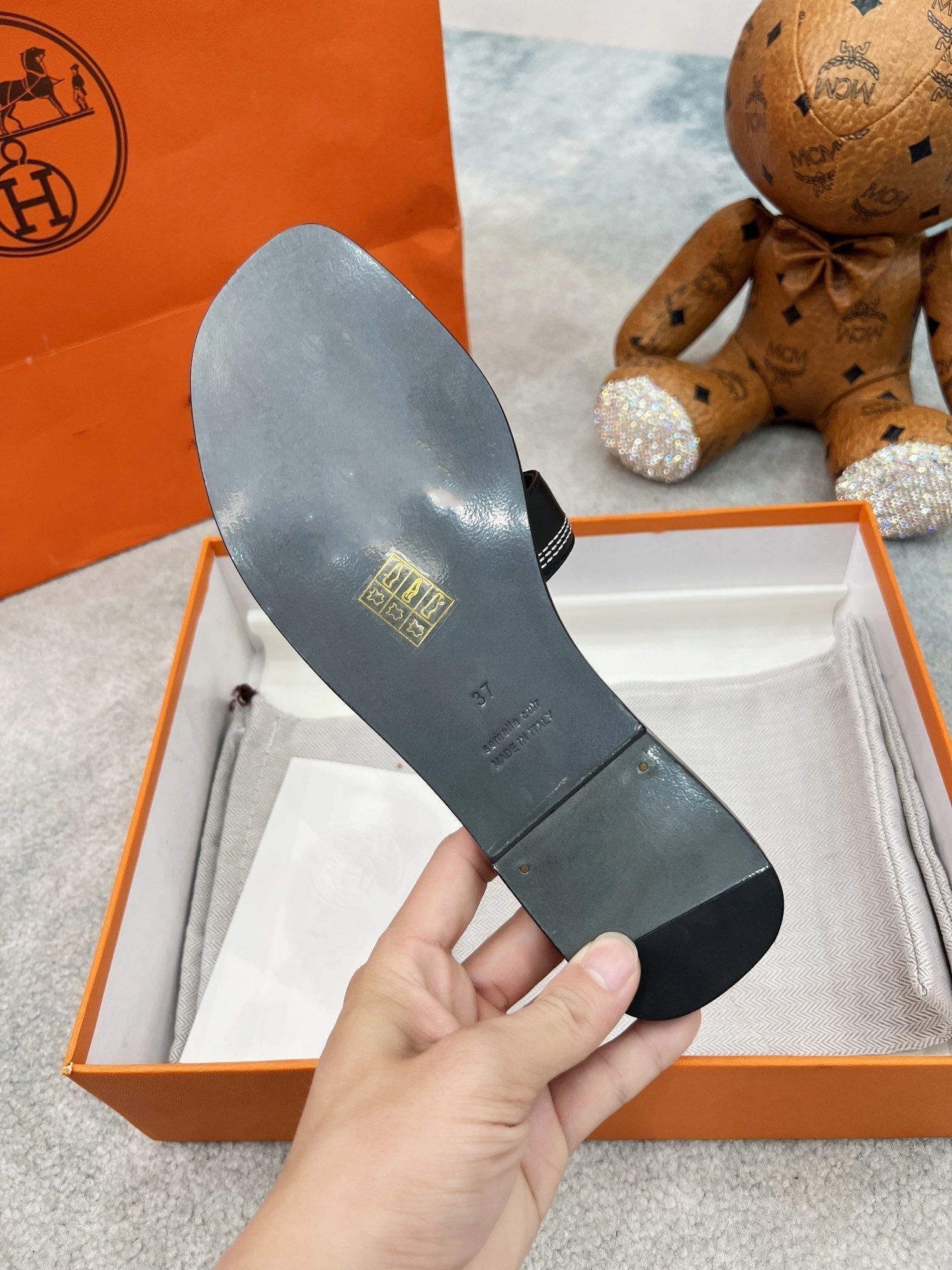 - Material: Sandal in calfskin with iconic "H" cut-out.