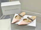 Manolo Flats Mules Diamond Buckle Pink Nude Silk Satin 327488