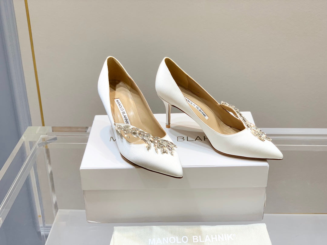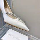 Manolo Wheat Ear Rhinestone High Heels Pumps White Silk Fabric 327453