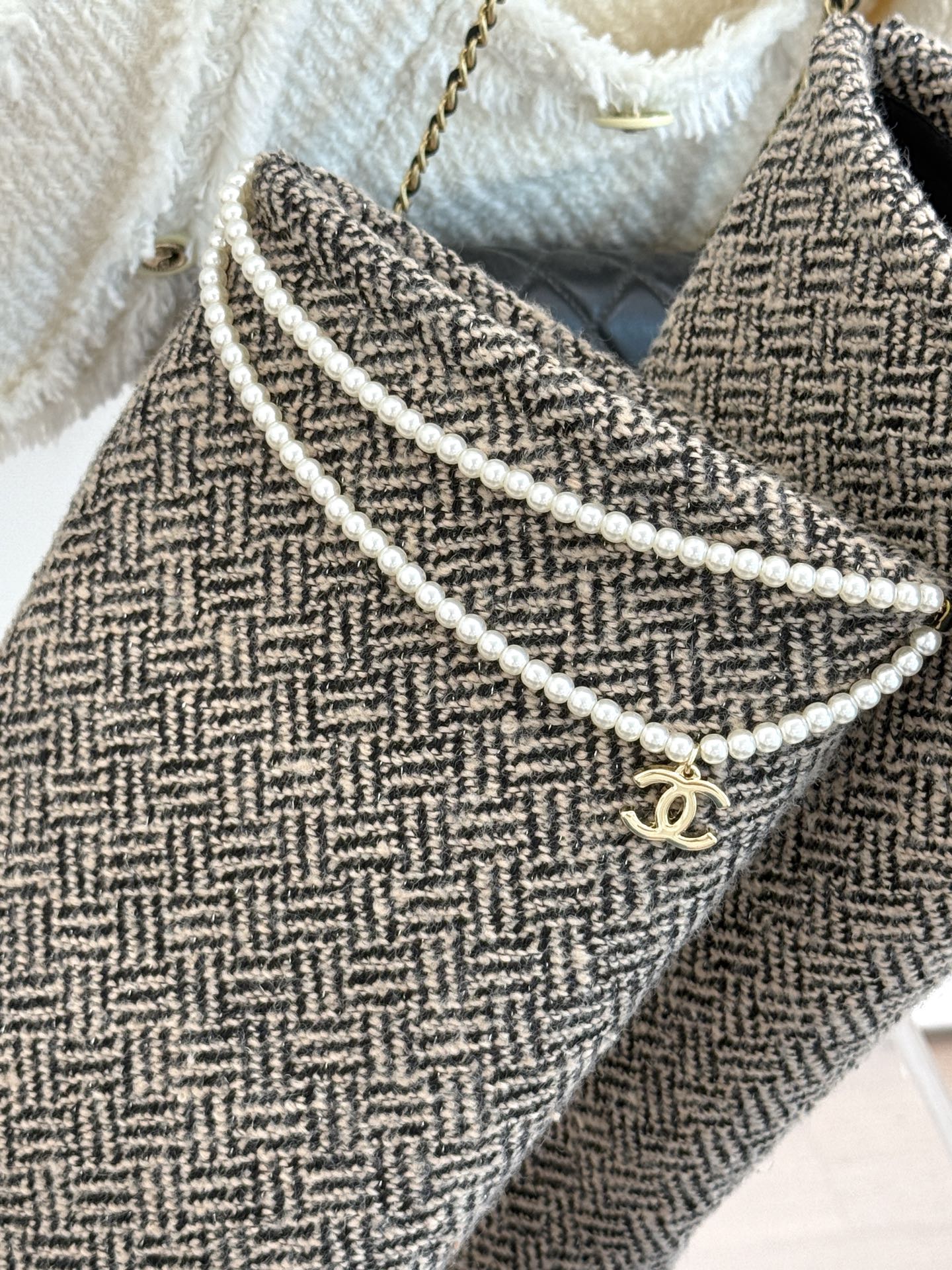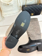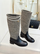 Chanel 25 Four-Leaf Clover Pearls Double C Long Boots Black Grey Woven Sheepskin 465406