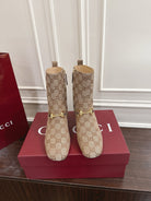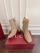 Gucci Horsebit Chunky Heel Ankle Boots Brown Beige Cowhide Fabric 490559