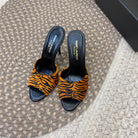 LA 16 HEELED MULES IN TIGER PATTERN RABBIT FUR