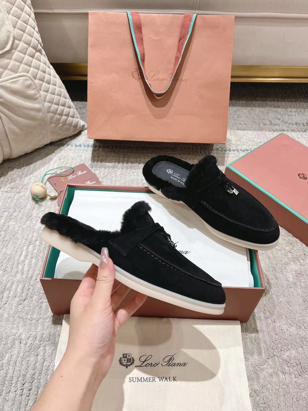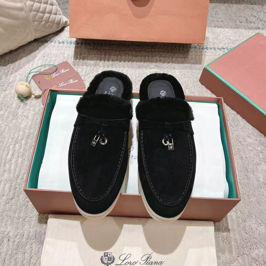 LP Charms Walk Babouche Loafer Black Suede With Rabbit Fur Lining 206239
