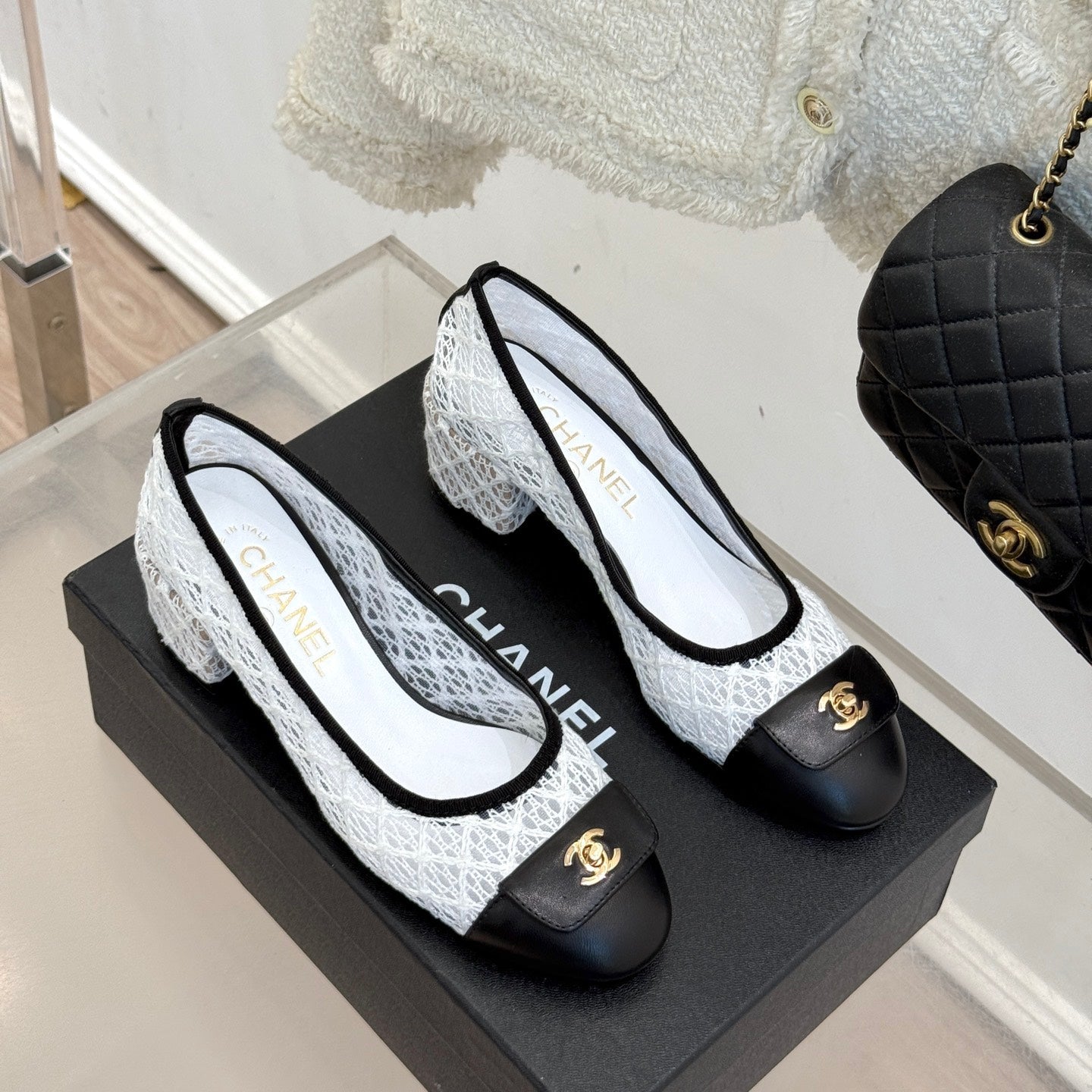 Chanel 25 Ballet Flat 50mm White Black Woven Lambskin 473053