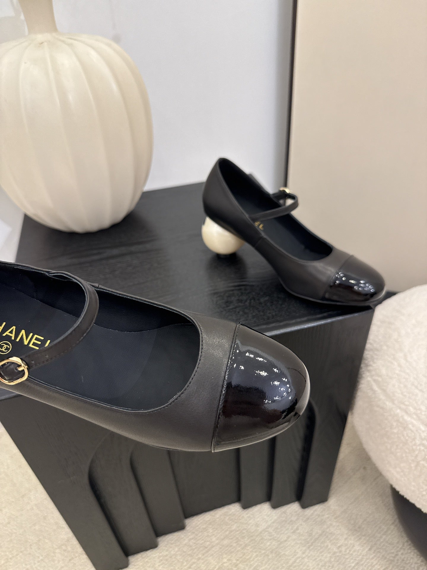 Chanel Mary Jane Pumps with Pearl Heels Black White Leather