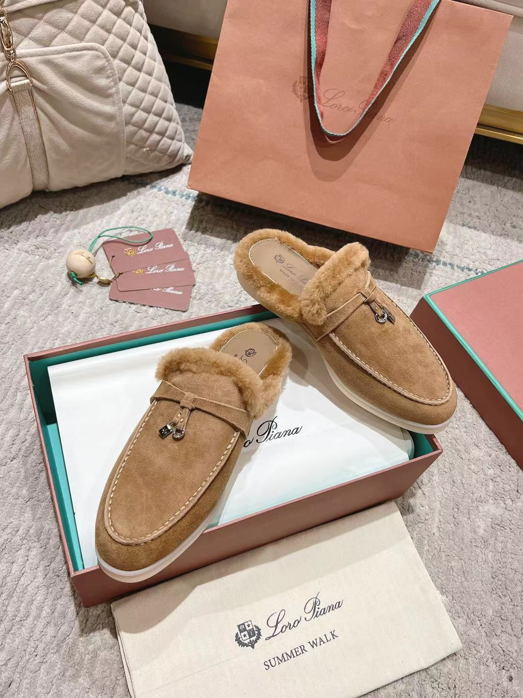 LP Charms Walk Babouche Loafer Marigold Brown Suede With Rabbit Fur Lining 206232