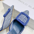 Manolo Mules 7cm Blue Hollow Lace Leather Bottom 451199