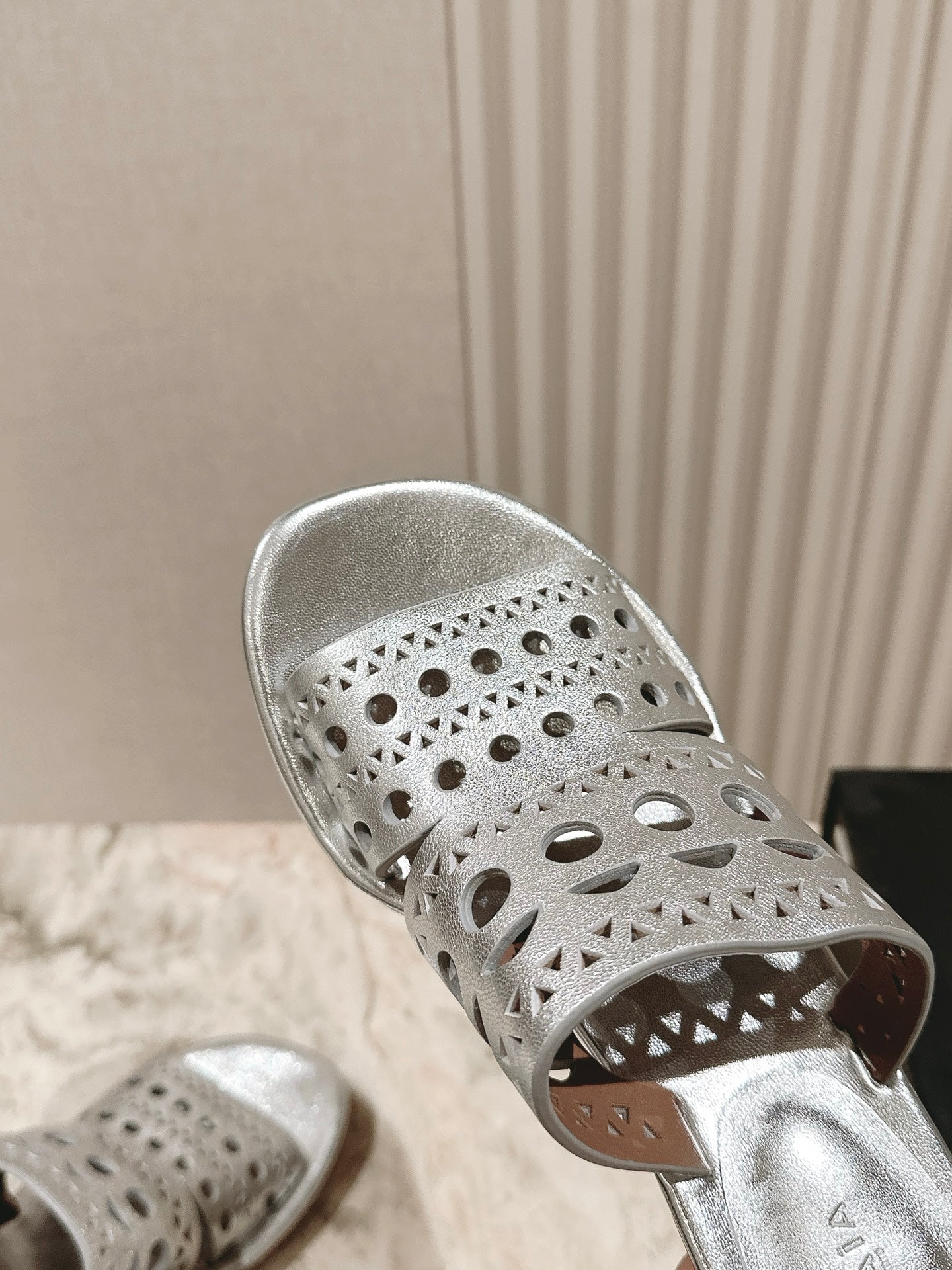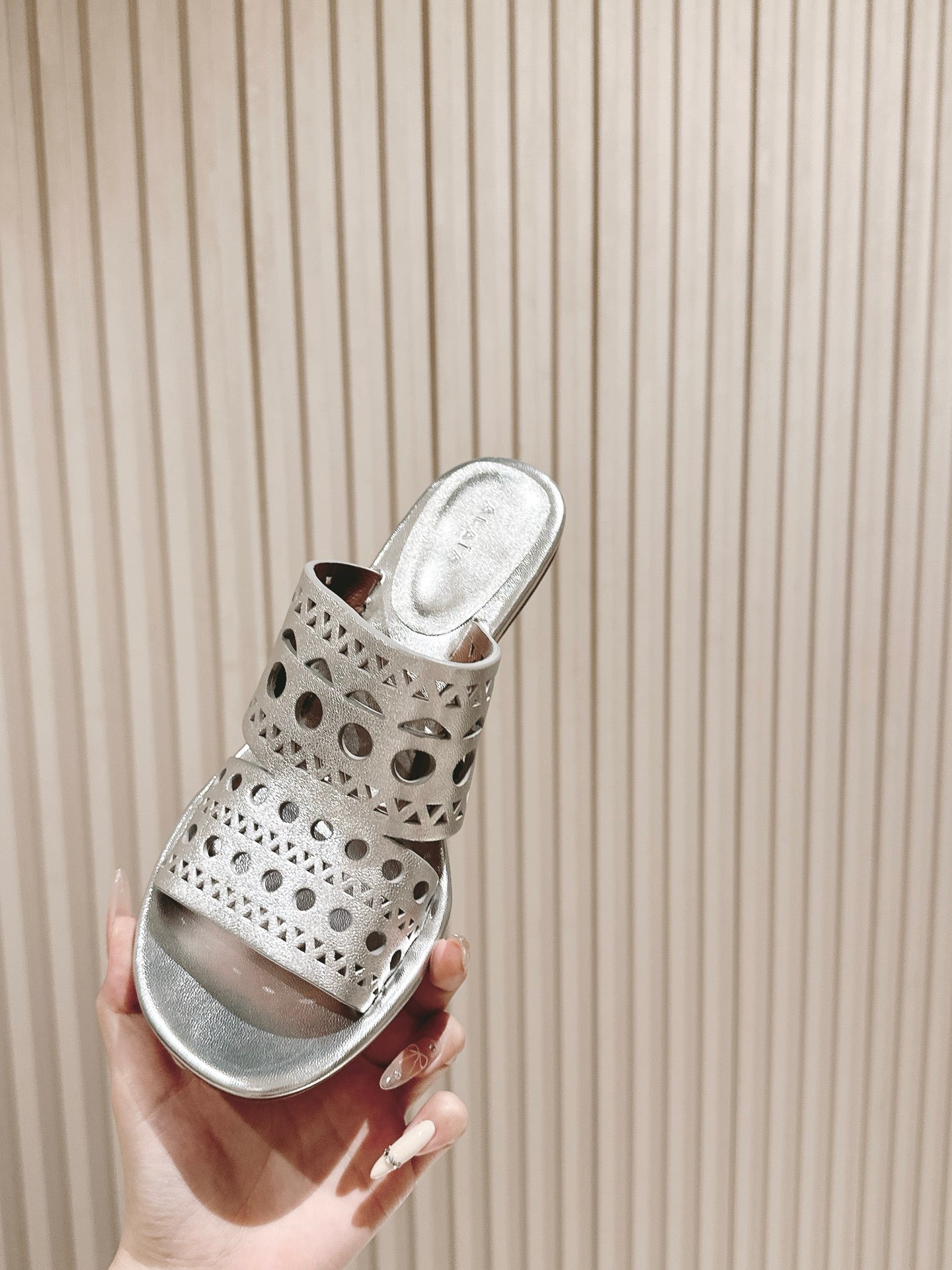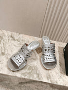 Alaia 2025 Vienne Cutout Kitten-Heel Slide Sandals Silver Leather 293647