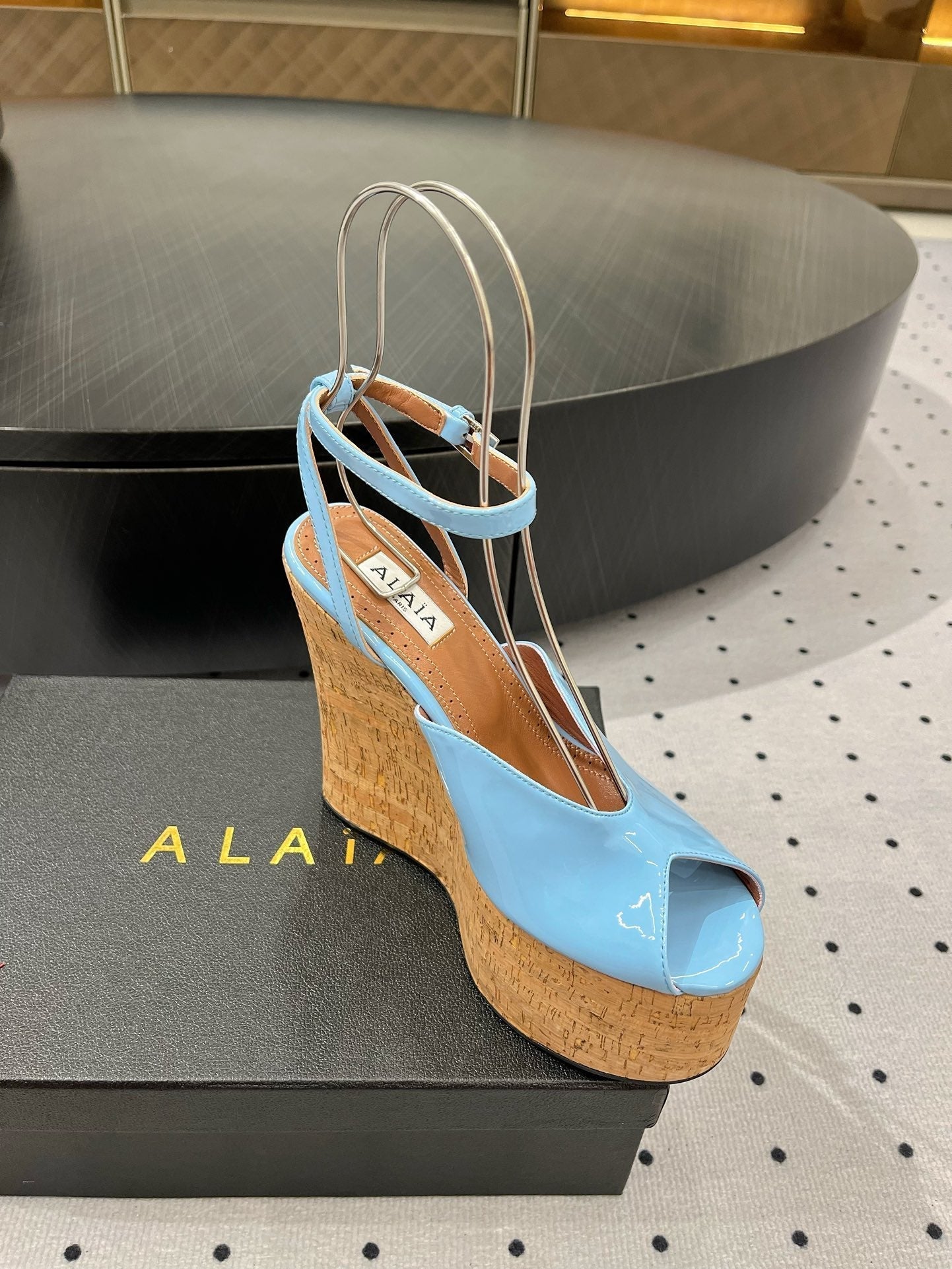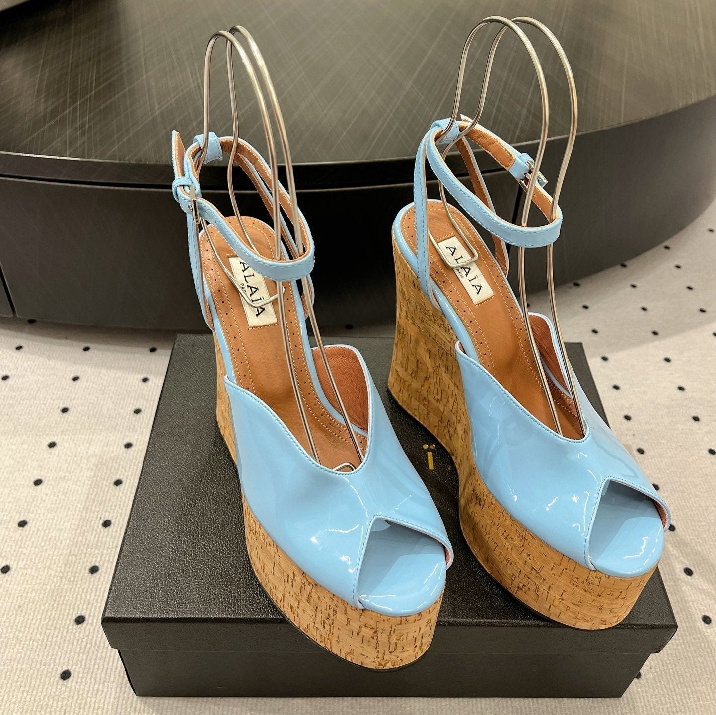 Alaila Wedge Sandals 135mm In Light Blue Glossy Lambskin 954899