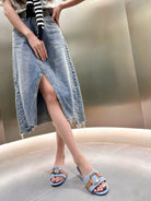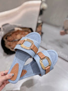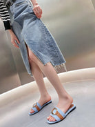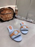 CHLOÉ SLIDE MULE IN LIGHT BLUE DENIM AND BROWN CALFSKIN GOLD HARDWARE