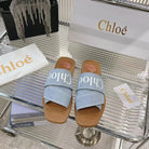 CHLOÉ WOODY MULE IN LIGHT BLUE DENIM WITH WHITE LOGO