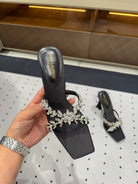 HIGH RHINESTONE CROSS STRAP MULES IN BLACK SILK