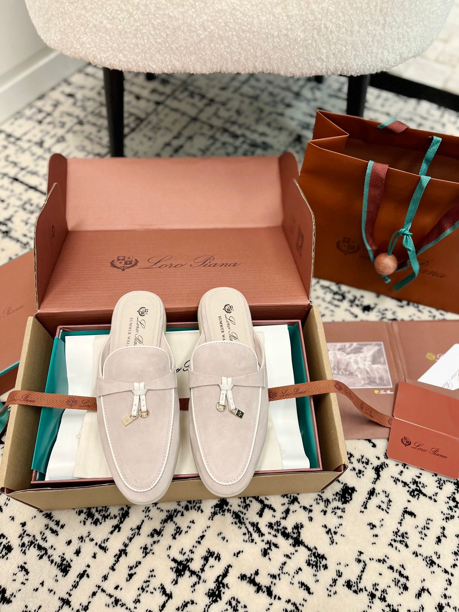 Loro Piana Light Grey White Suede Charms Walk Flat Mules