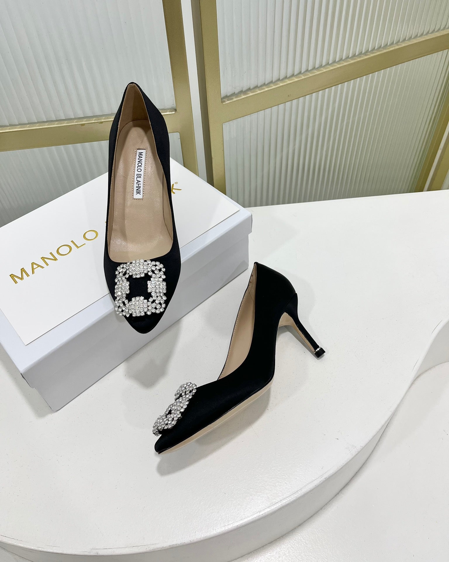 Manolo Hangisi Black Satin Jewel Buckle Pump 95