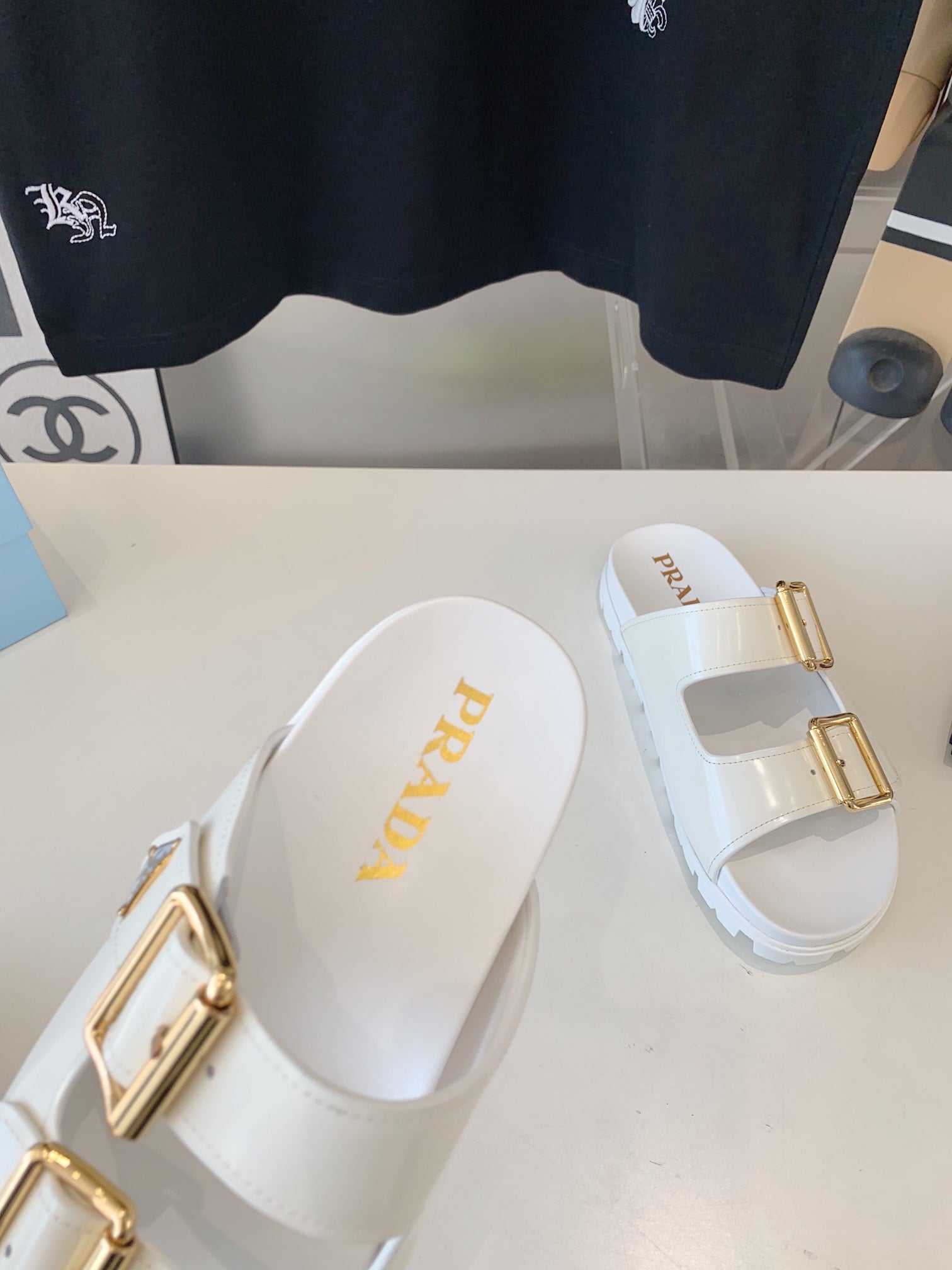 PRA STRAP SLIDES SANDALS GLOSSY WHITE CALFSKIN