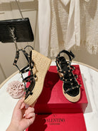ROCKSTUD ANKLE STRAP WEDGE SANDAL IN BLACK CALFSKIN LEATHER 95 MM