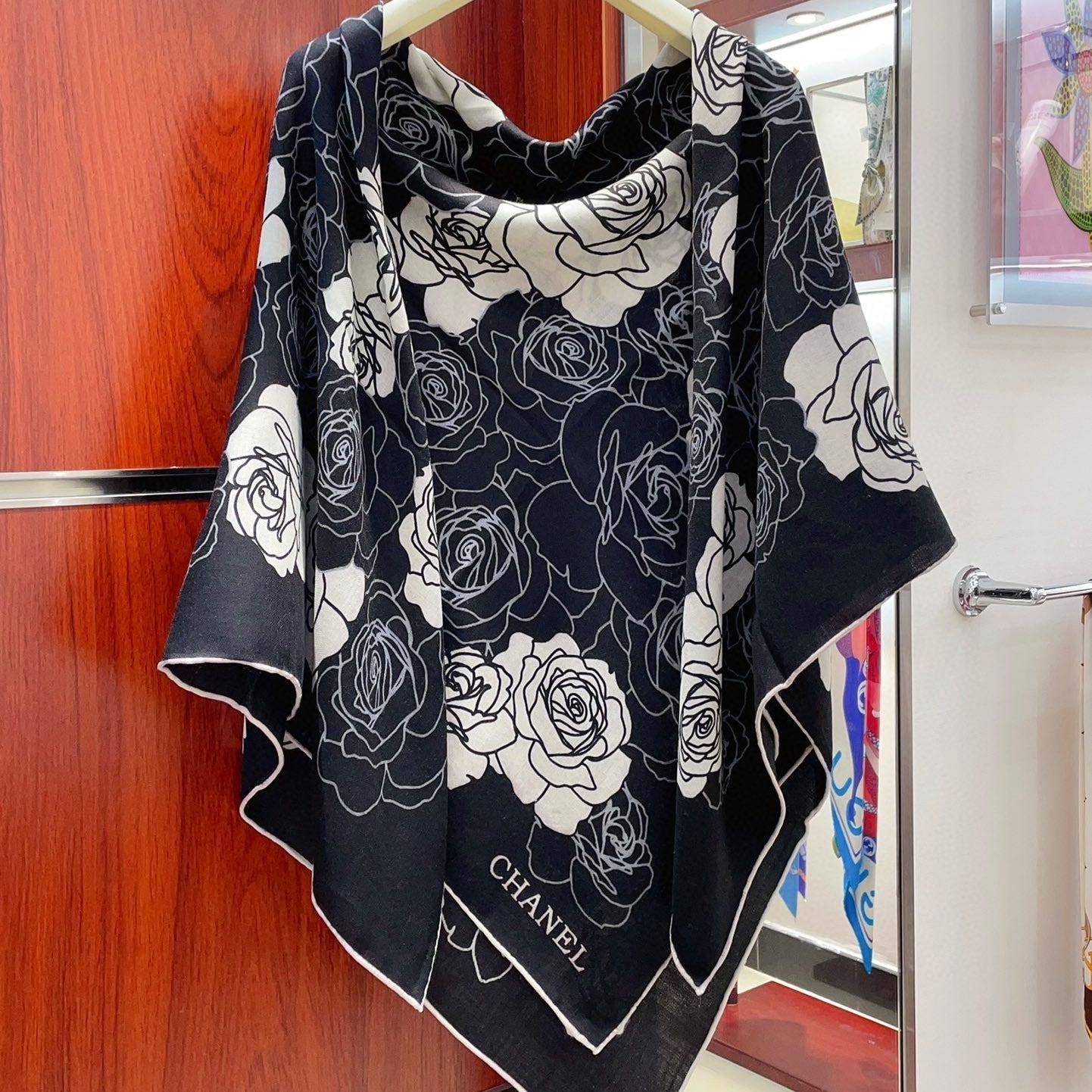 CC Square Scarf 140 CM In Black Mix White Small Flower Cashmere And Silk 342864