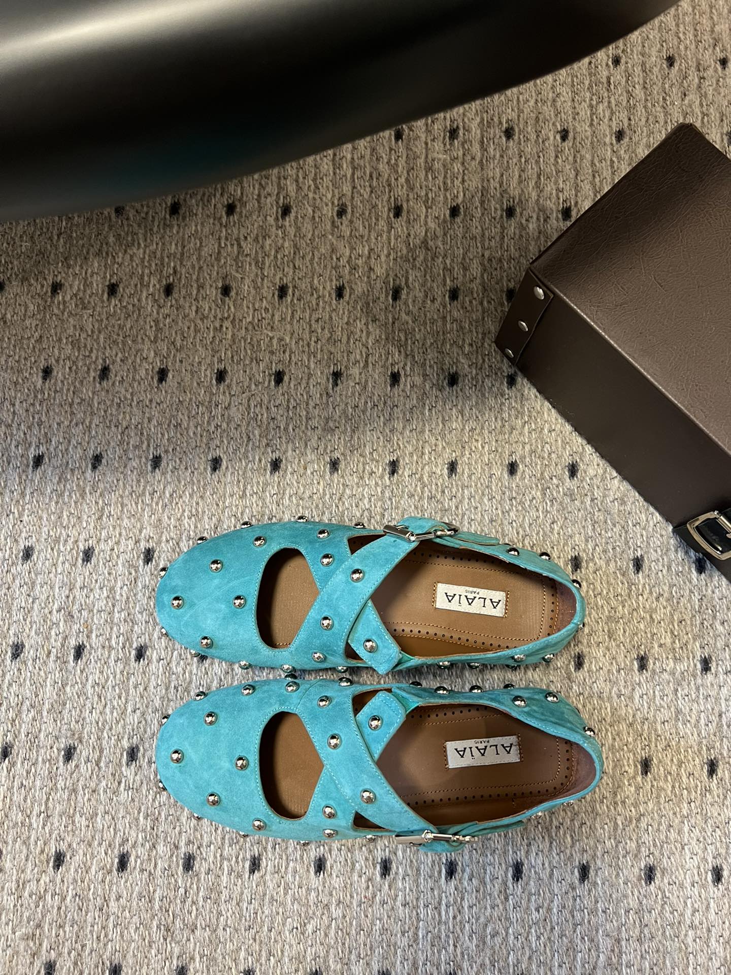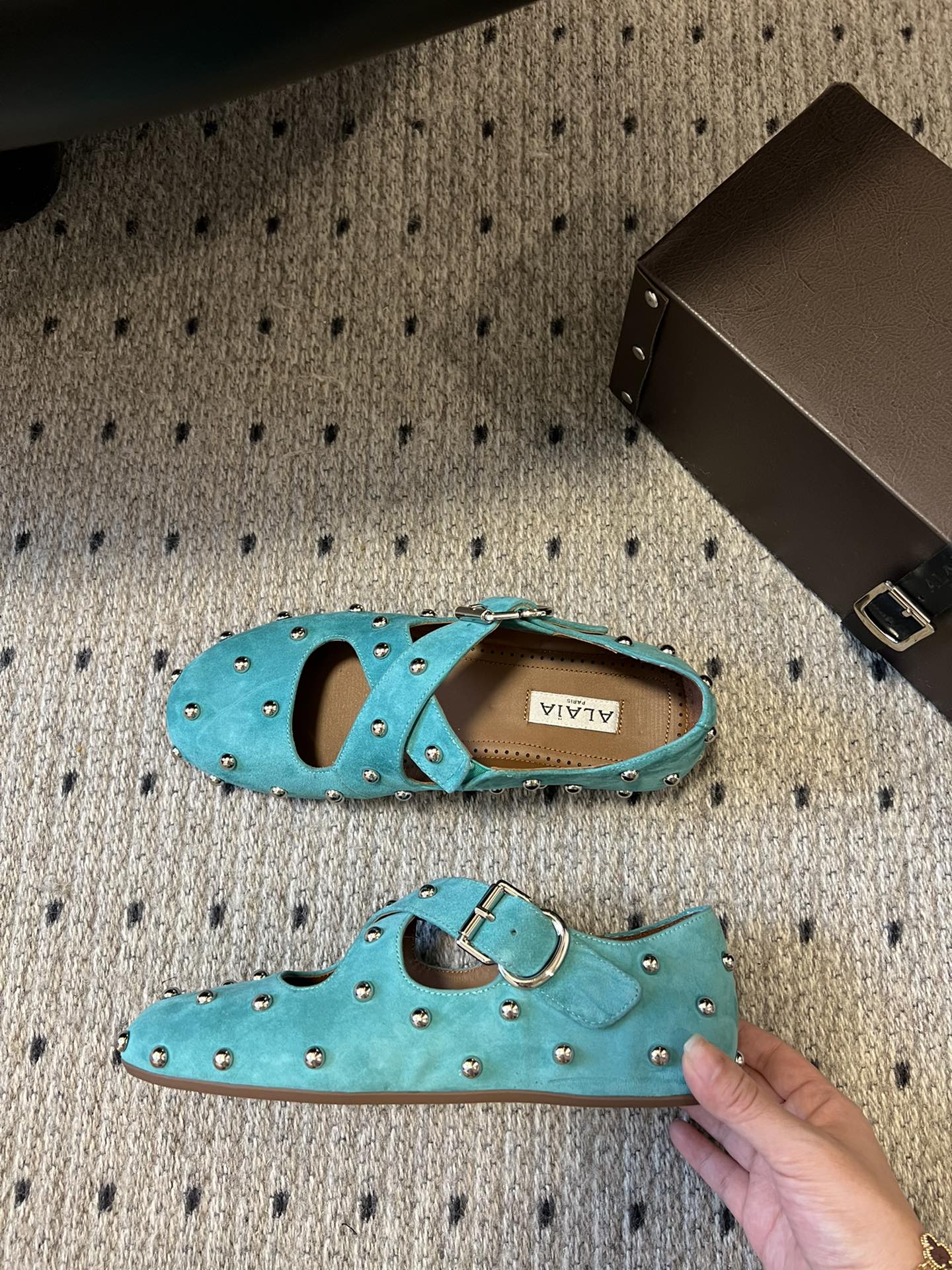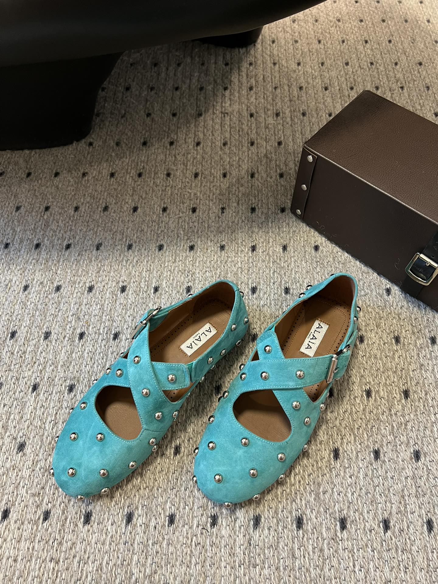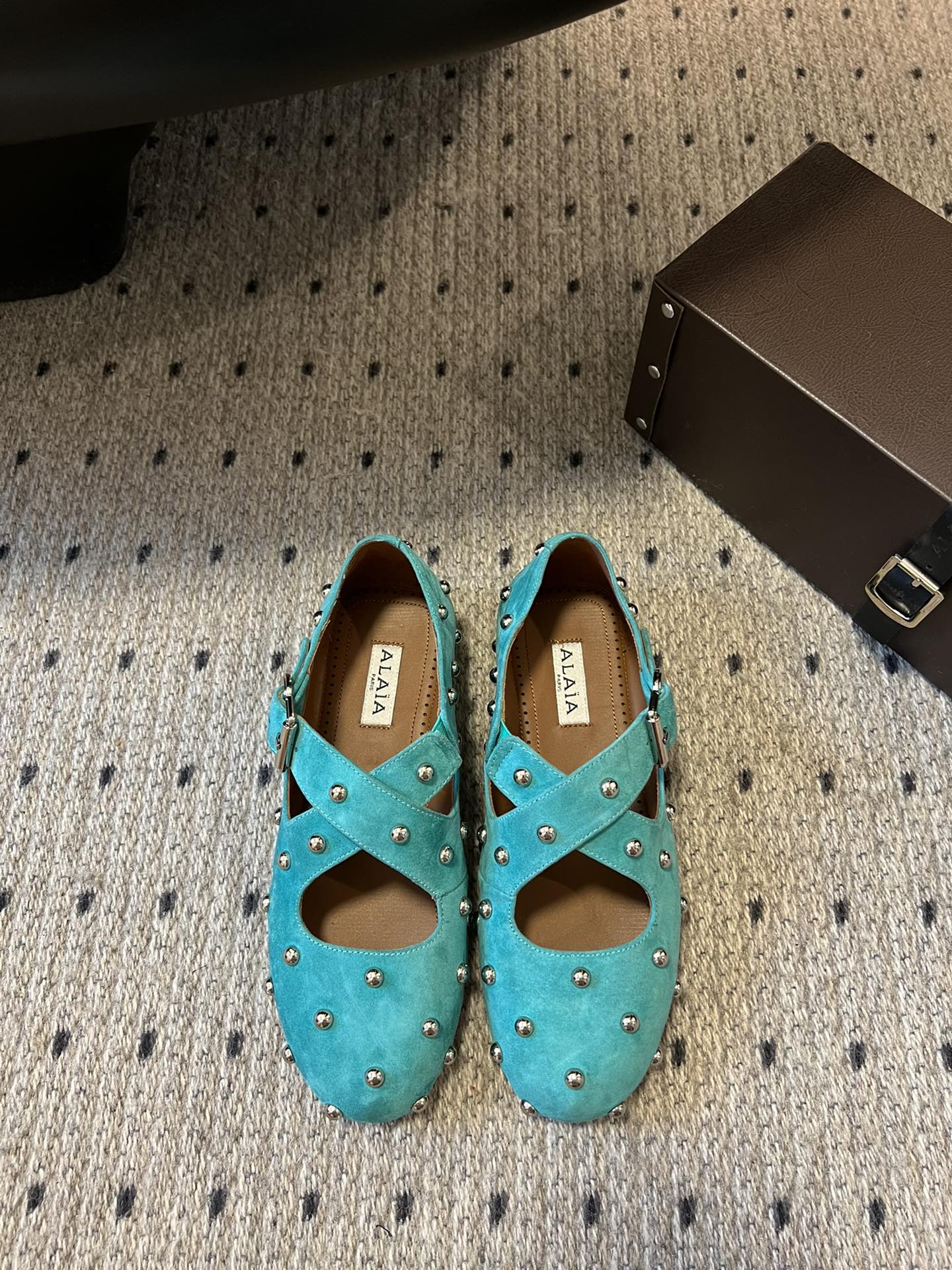 Alaia 25 Criss Cross With Stud Ballet Flats Lagoon Green Suede Sheepskin 303692