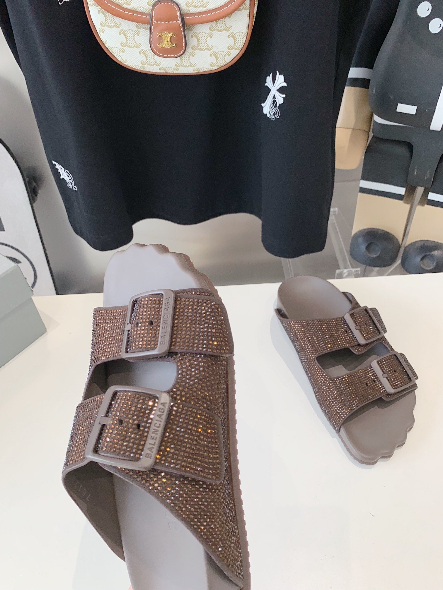 BIRKENSTOCK SLIPPERS ATTACHED RHINESTONES IN BROWN CALFSKIN