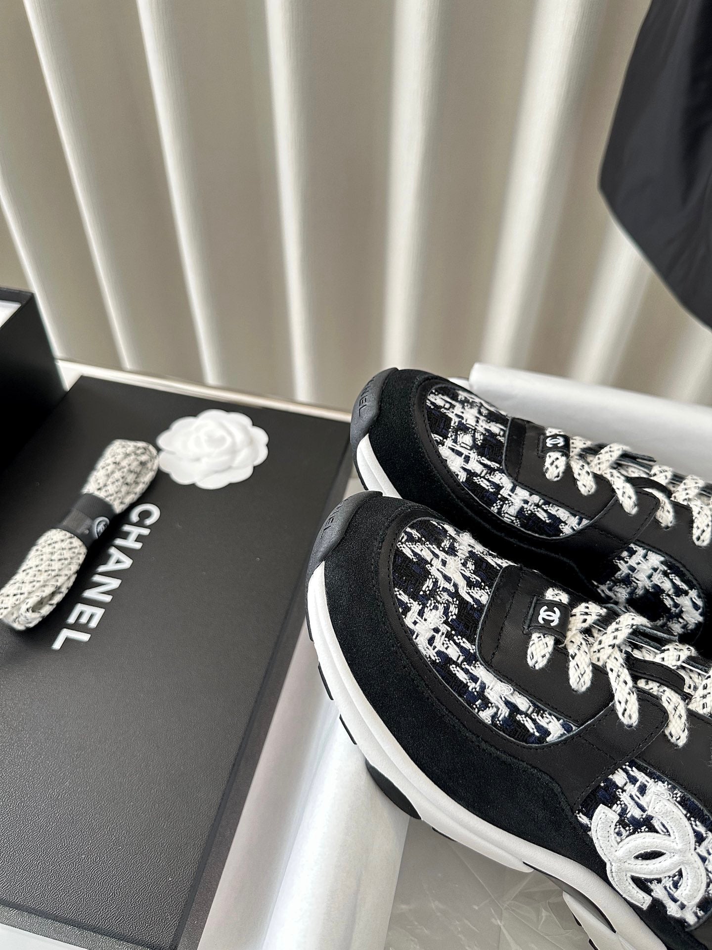 cc sneaker black white tweed black calfskin suede calfskin