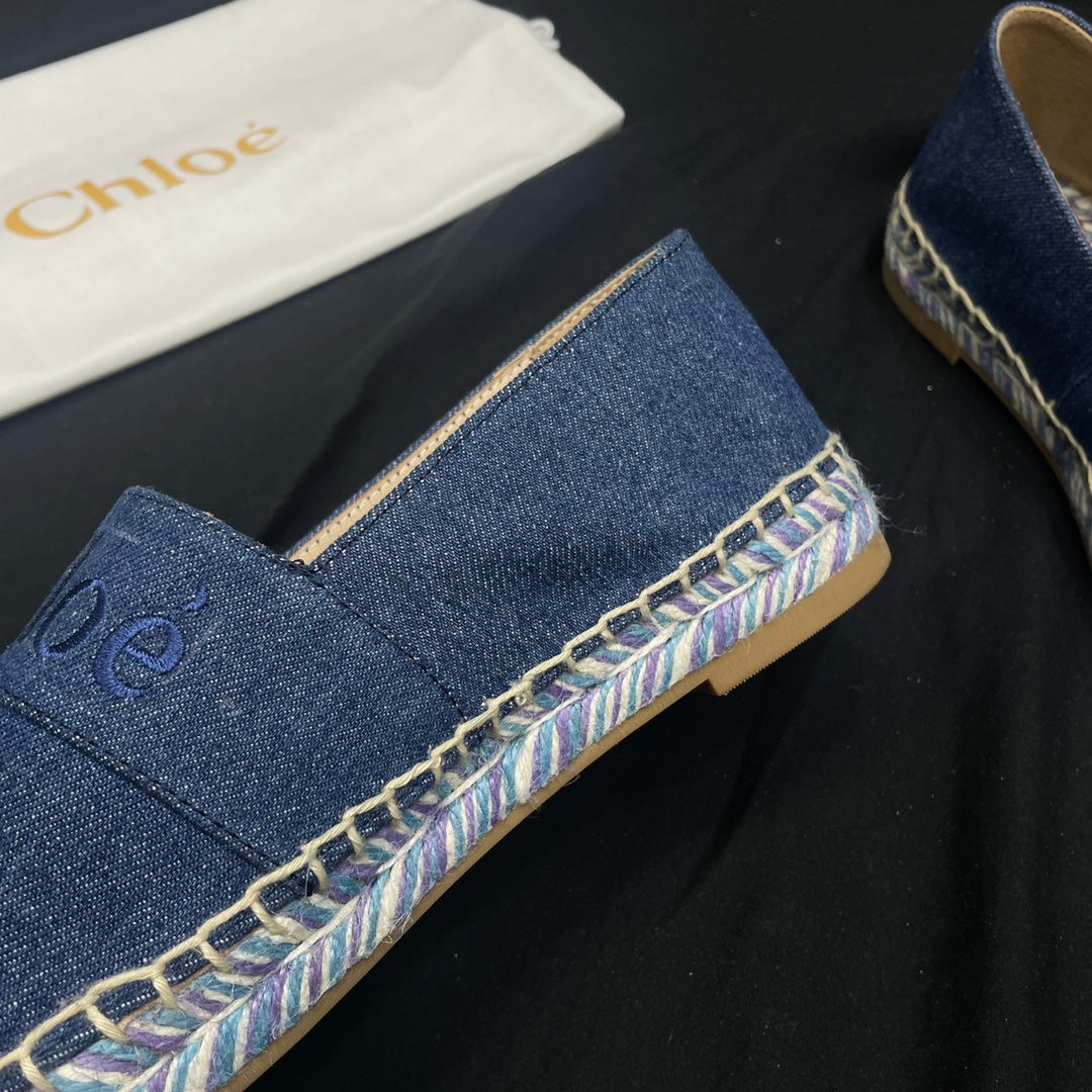 CHLOÉ WOVEN LOAFER IN NAVY BLUE DENIM AND COLORFUL RAFFIA