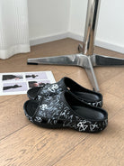 POOL GRAFFITI CROCS SLIDE SANDALS IN BLACK AND WHITE RUBBER