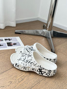 POOL GRAFFITI CROCS SLIDE SANDALS IN WHITE AND BLACK RUBBER
