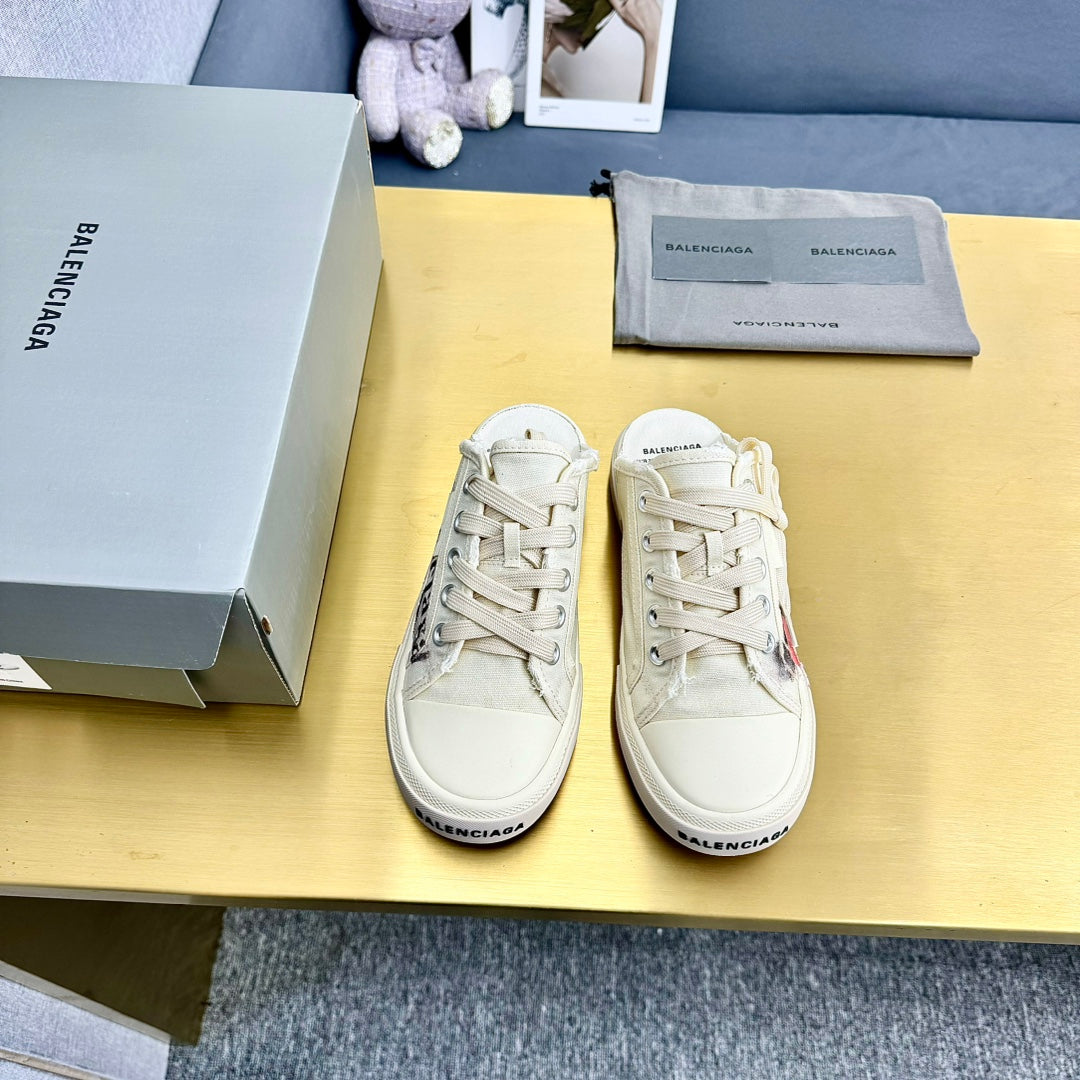 SNEAKER MULES IN WHITE CANVAS GRAFFITI LOGO