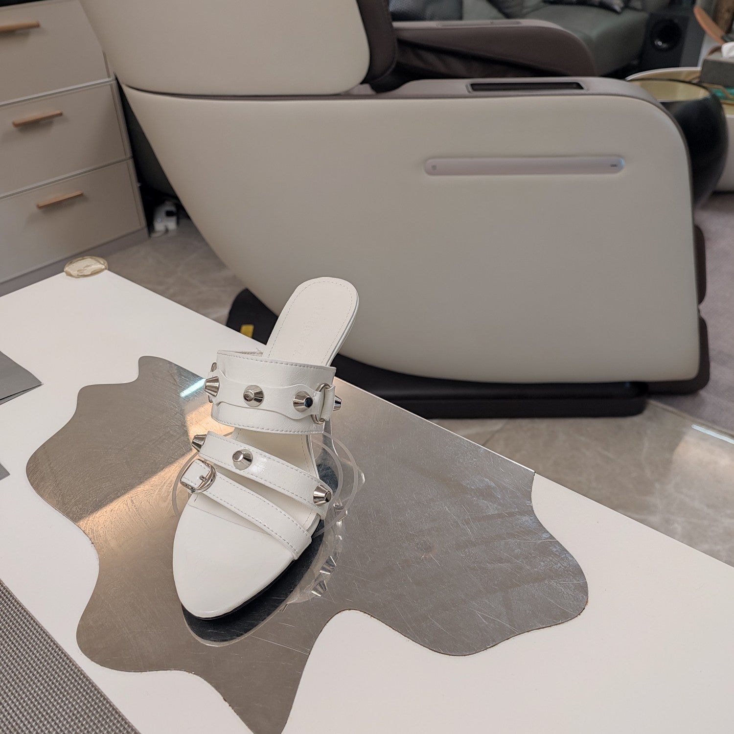 STRAPPY HIGH-HEELED SANDALS IN WHITE STUDDED WAX-OIL SHEEPSKIN