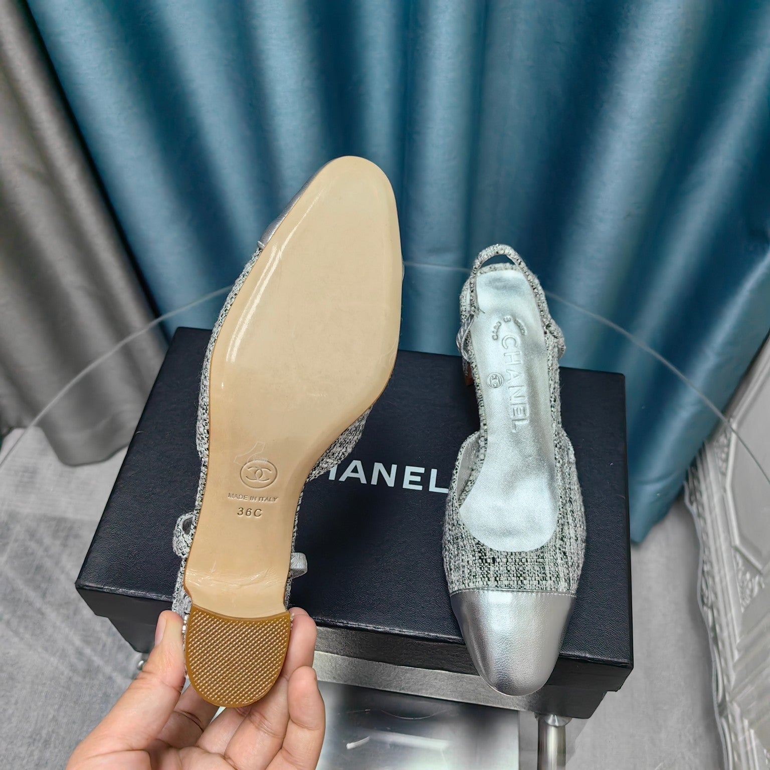 slingbacks 65 black white canvas silver metalic calfskin