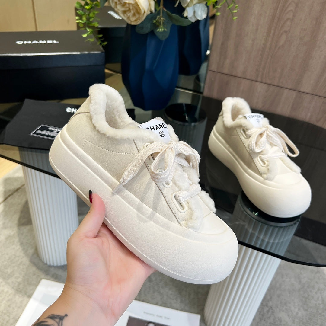 CC Sneaker Thick-Soled White Suede Wool Lining Fleece